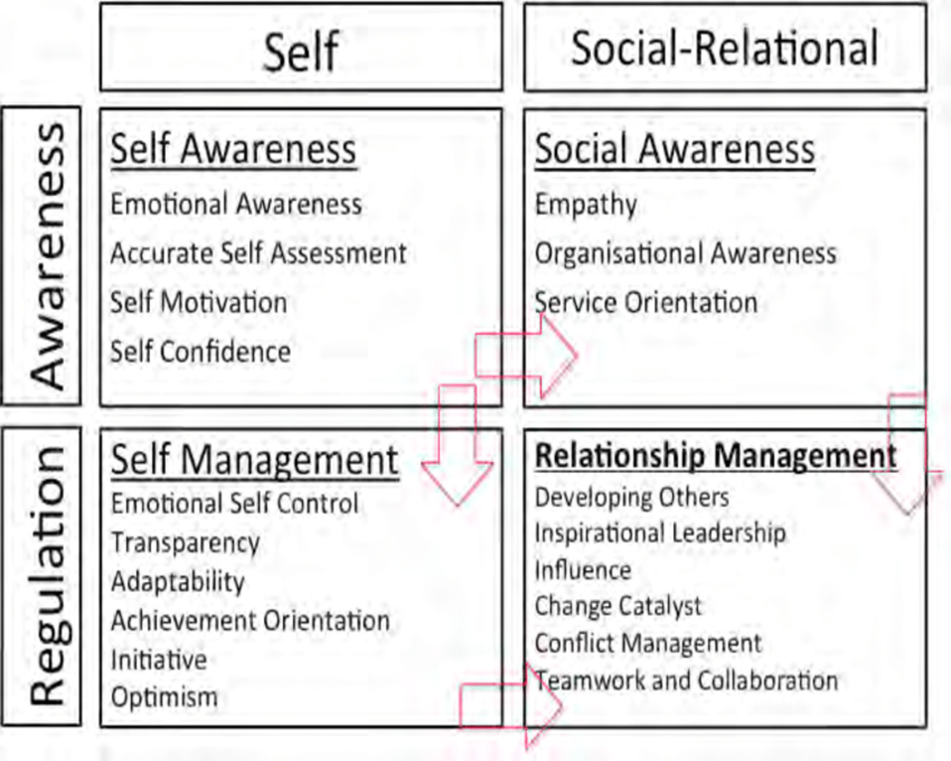 This construct largely comes from the work of psychologist Daniel Goleman. It starts with awareness. You begin by noticing what’s going on emotionally within yourself and in others. From there comes regulation or management – of yourself and of your relationships. Think of it as recognition and response.