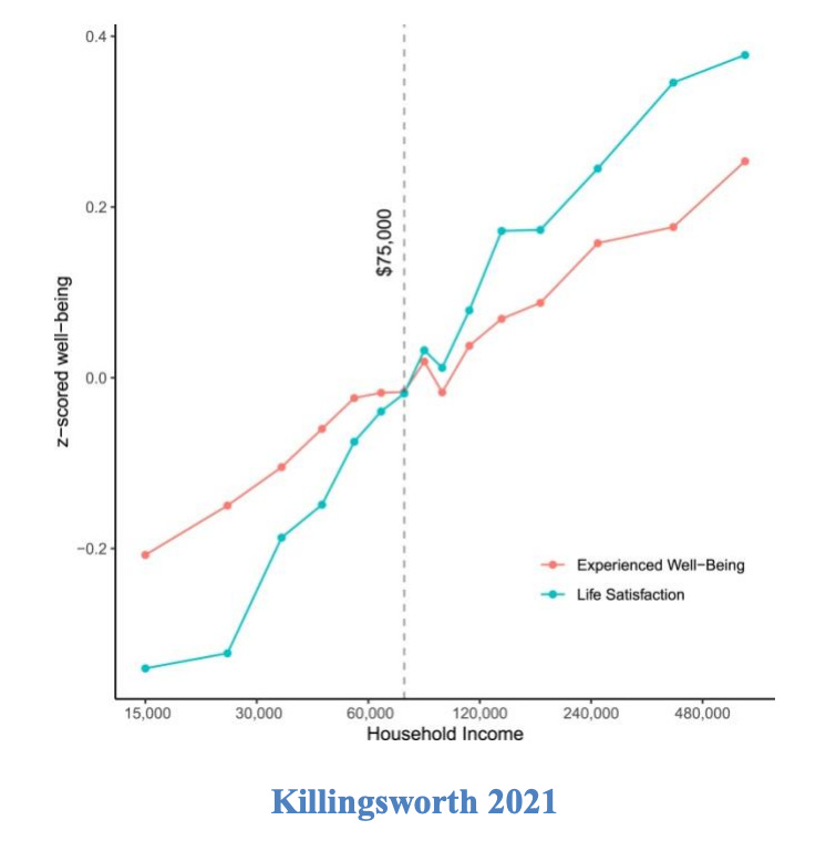 There has been debate over this finding in recent years. The most well-known example is Matt Killingsworth’s aptly named “Experienced well-being rises with income, even above $75,000 per year.” (2)