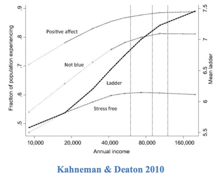Likely the most famous (and misunderstood) study on happiness and income is Kahneman and Deaton’s 2010 paper: “High income improves evaluation of life but not emotional well-being.” (1) It is often cited to say that beyond $75,000 per year income does not increase happiness. The research is more nuanced than that.