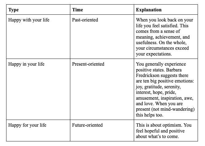 When you are satisfied with your life (past-oriented), experiencing positive emotion in your life (present-oriented), and feeling good about your life to come (future-oriented) – you have “Happiness with a capital H.”